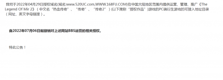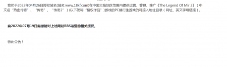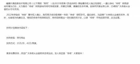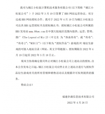 202204-26福建扑满信息技术有限公司(以下简称“我司”)自2021年获得《热血传奇》原始著作权人独占性授权,一直...