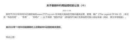我司于2022年08月24日授权域名www.2727cq.com 在中国大陆地区范围内提供运营、管理、推广《The Legend O...