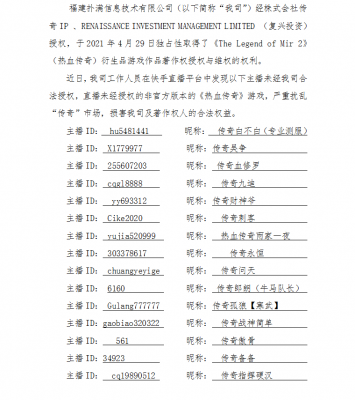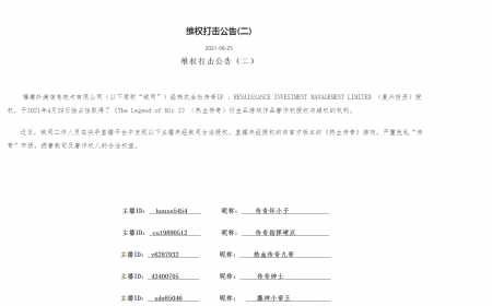 202108-25维权打击公告 福建扑满信息技术有限公司(以下简称“我司”)经株式会社传奇IP 、RENAISSANCE INVESTMENT MANAGEMENT L...