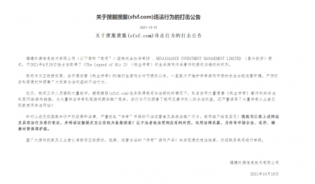202110-13关于搜服搜服(sfsf.com)违法行为的打击公告 福建扑满信息技术有限公司(以下简称“我司”)经株式会社传奇IP 、RENAISSANCE...